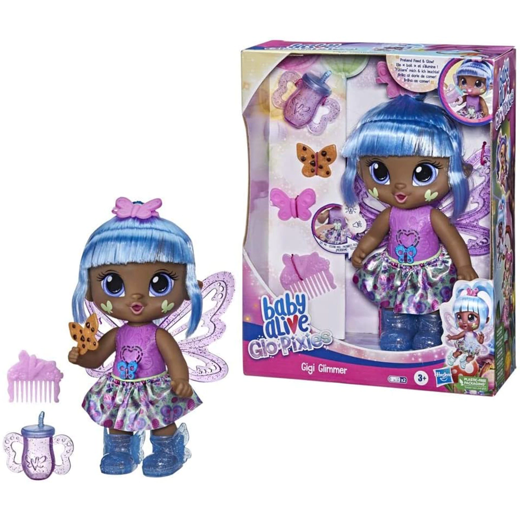 A boneca GloPixies Gigi Glimmer revela o seu brilho quando come a comida de mentirinha ou quando as crianças a partir de 3 anos apertam o seu botão de borboleta. Onde ela vai brilhar? Qual cor ela vai usar? As crianças vão descobrir quando a boneca comer o seu cookie ou tomar do seu copo. A boneca Gigi Glimmer possui roupas mágicas e brilhantes e vem com uma marquinha de fada na bochecha. As crianças podem pentear os cabelos azuis da boneca com o pente incluído. Esta boneca fada Baby Alive se ilumina em parte diferentes, como boca, asas e barriguinha.
