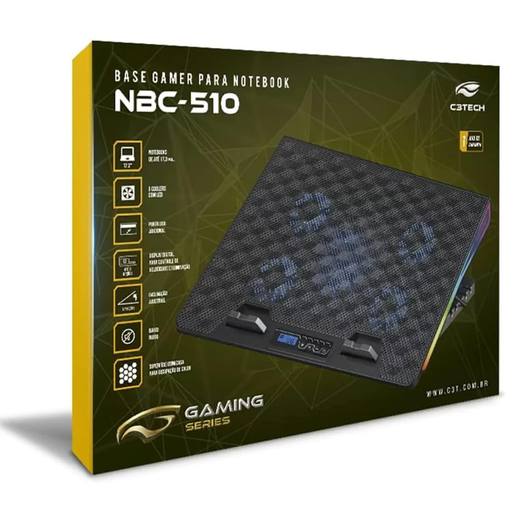 Experimente o máximo em conforto e estilo com nossa Base para Notebook Gamer NBC-510BK. Projetada para notebooks de até 17,3 polegadas, esta base oferece não apenas uma ampla gama de inclinações para atender às suas necessidades ergonômicas, mas também apresenta um deslumbrante sistema de iluminação RGB para aprimorar o ambiente de jogo.