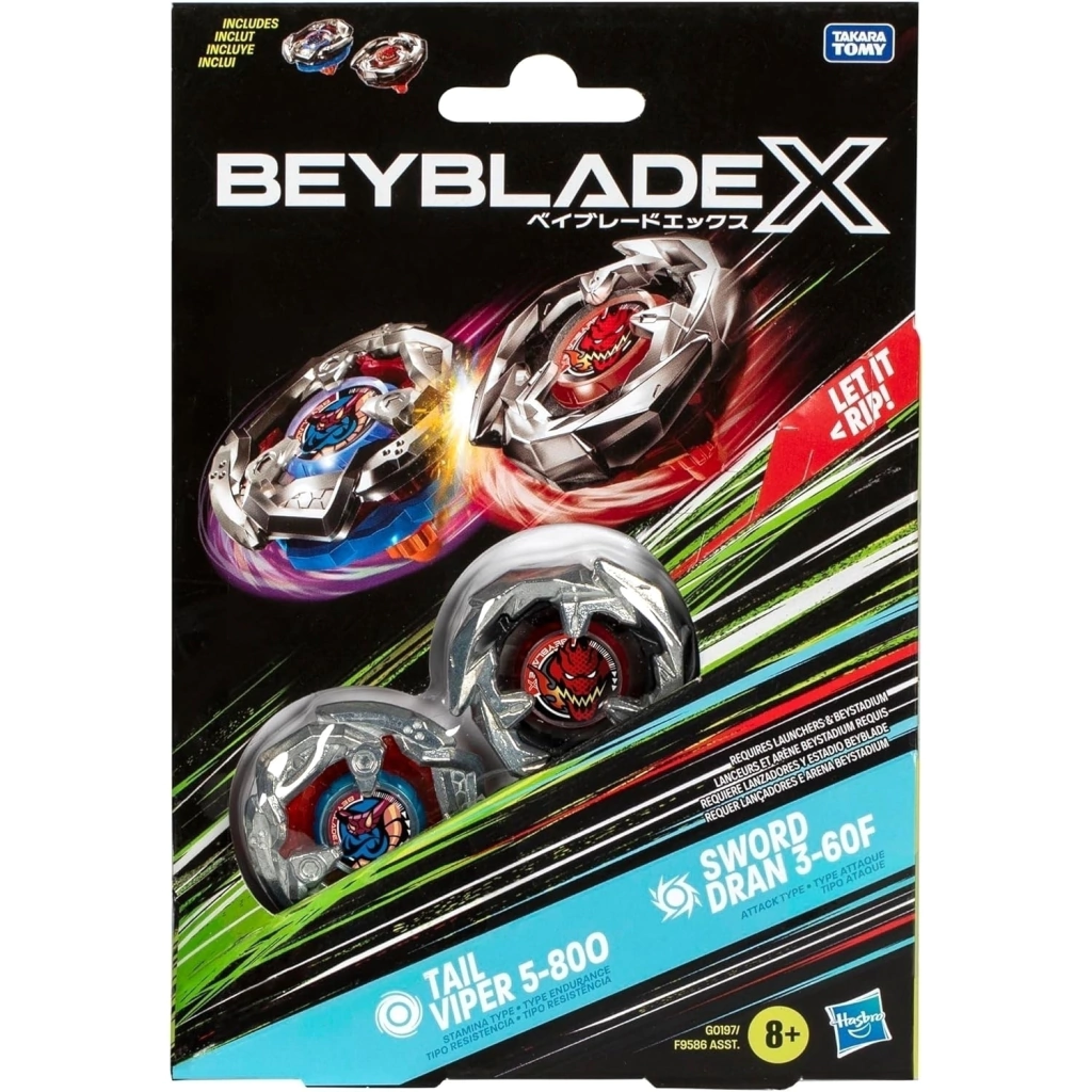 Toda a emoção da nova geração de arenas, lançadores e piões Beyblade está neste kit Beyblade X, que inclui os piões Tail Viper 5-80O e Sword Dran 3-60F de giro à direita (lançador e arena Beystadium vendidos separadamente). Entre diretamente na batalha ou personalize as camadas intercambiáveis da lâmina, engrenagem e ponta com outros piões Beyblade X (vendidos separadamente). O Beyblade X traz o sistema de engrenagem X-Celerator para elevar a intensidade da batalha. Quando as engrenagens dos piões Beyblade X encontram a guia da arena Beystadium, os piões são lançados com um avanço Xtreme, alcançando velocidades surpreendentes que geram eclosões incríveis e impactos colossais. Os fãs lançam os seus piões em batalhas selvagens contra os seus oponentes, e o primeiro a marcar 4 pontos é o vencedor. Os brinquedos Hasbro Beyblade com metal fundido Takara Tomy autêntico são excelentes presentes para meninos e meninas a partir dos 8 anos.