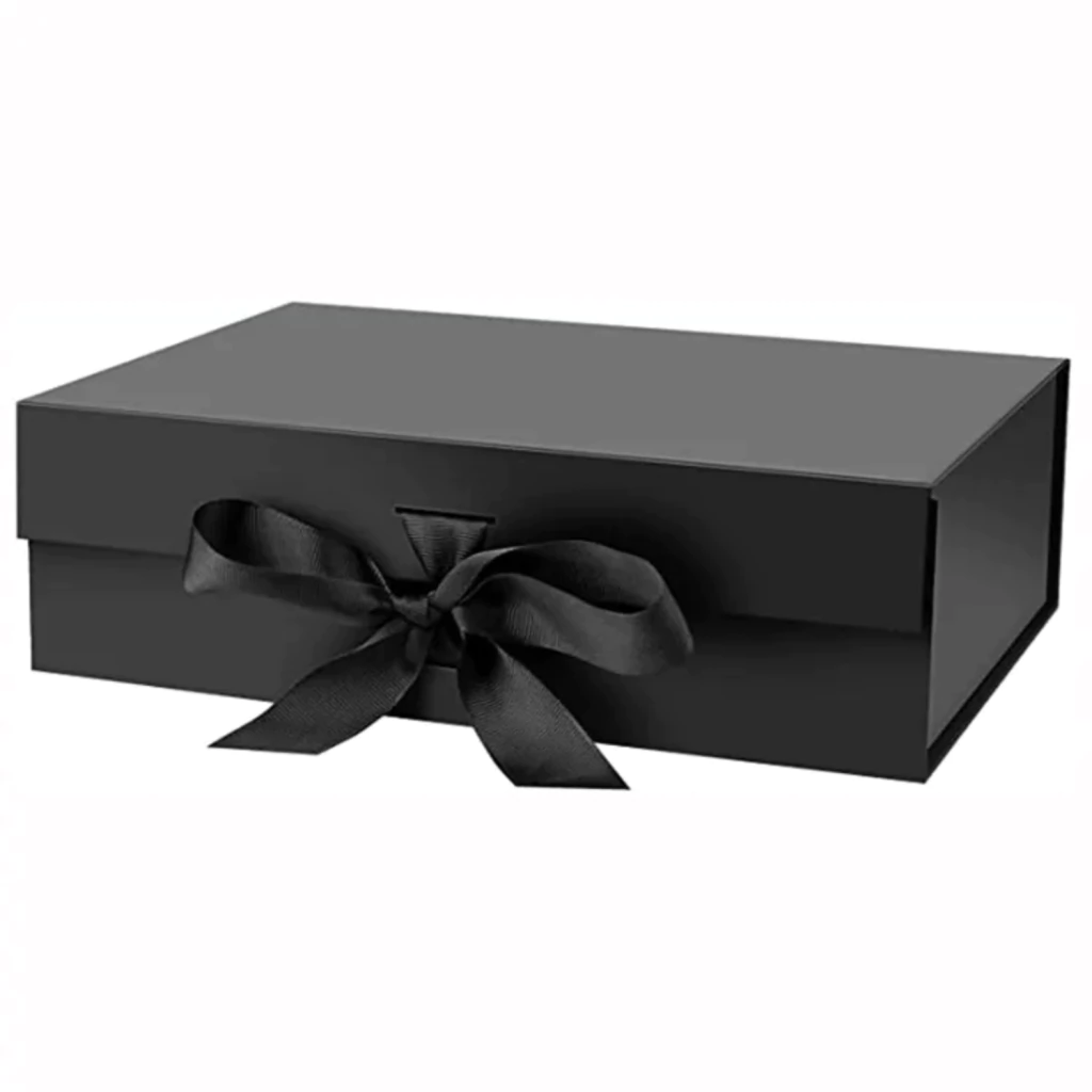 A Caixa Dobrável com Fita de Cetim Preta – Tamanho P (28,2x20,2x9,2cm) é uma embalagem versátil e elegante, ideal para quem busca sofisticação em presentes e kits especiais. Fabricada com papel rígido de alta qualidade, conta com acabamento fosco e uma fita de cetim na mesma cor, proporcionando um toque refinado ao visual da caixa.