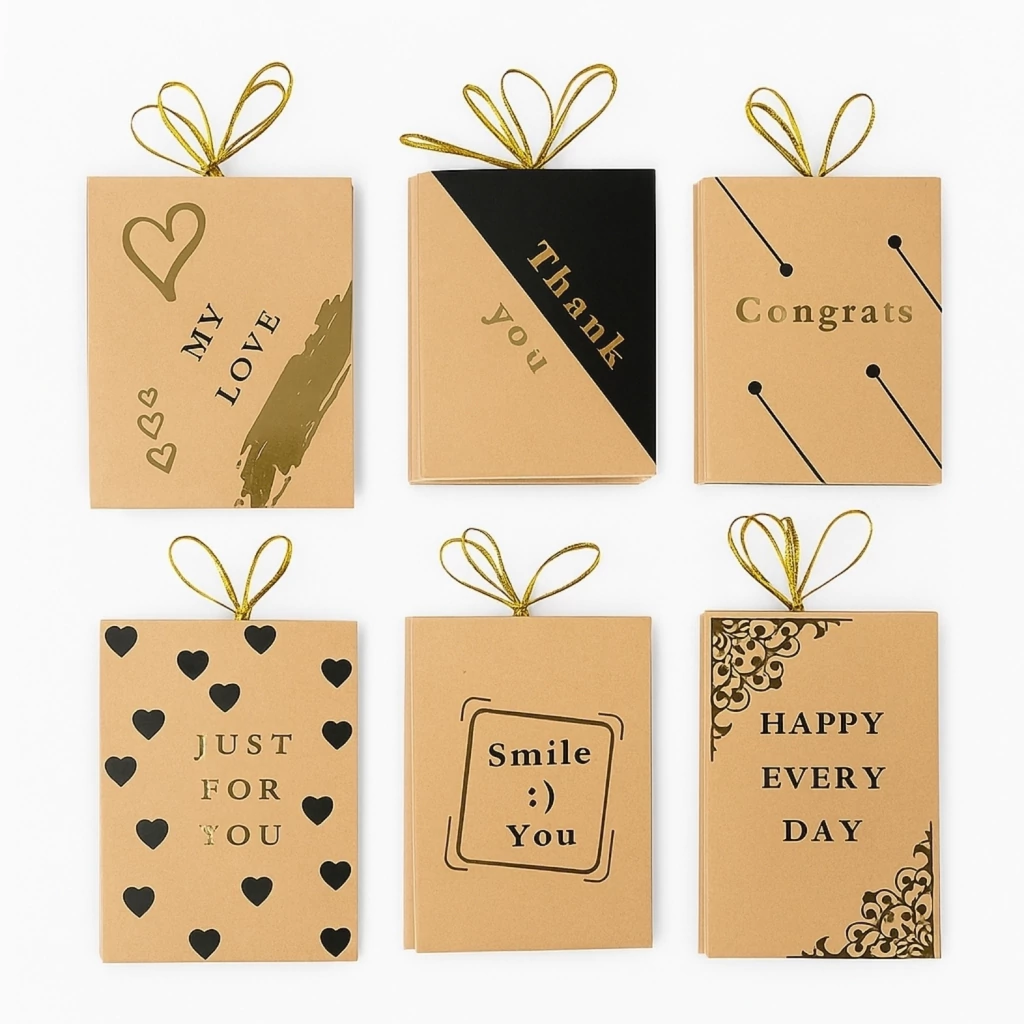 O Kit com 128 Cartões de Presente Kraft 9x6,5cm é ideal para tornar seus presentes ainda mais especiais. Com estampas sortidas e cordão dourado incluso, cada cartão vem com mensagens positivas como “Thanks”, “Just for you”, “Happy every day”, entre outras.