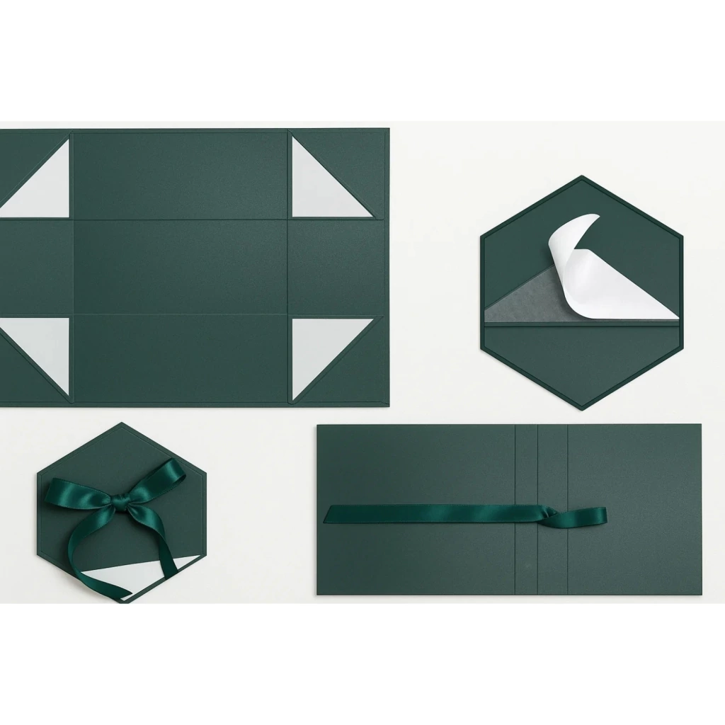 O sistema de fechamento com imã garante firmeza e um visual moderno, enquanto a fita de cetim verde dá o toque final ao seu presente. Embalagem dobrável e reutilizável, fácil de montar e armazenar.