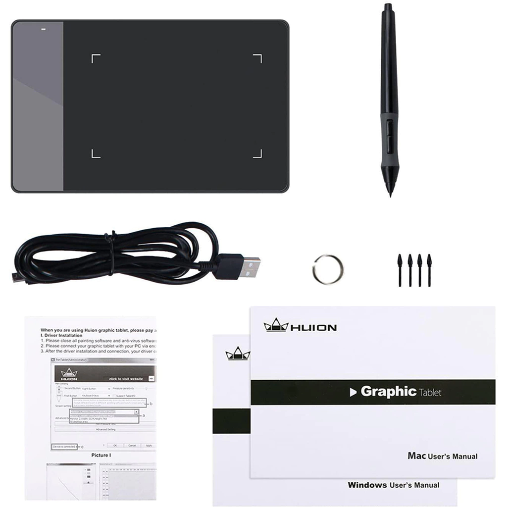 Conteúdo da Embalagem: Tablet gráfico Huion 420 Cabo USB para tablet Caneta sem fio (com 2 botões programáveis, 1 pilha AAA) 4 pontas de caneta