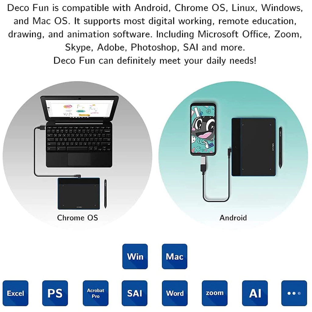 O tablet de desenho gráfico XP-PEN Deco Fun S é compatível com Windows 7/8/10, Mac OS X 10.10 (ou posterior), Android 6.0 (ou posterior), Chrome OS 88 (ou posterior), e é compatível com Linux agora. É adequado para desenho digital, pintura, esboços, assinaturas eletrônicas, ensino online, trabalho remoto, edição de fotos, jogos OSU, educação remota, etc. Registre seu tablet XP-PEN na XP-PEN Web para receber programas ArtRage Lite, ExplainEverything
