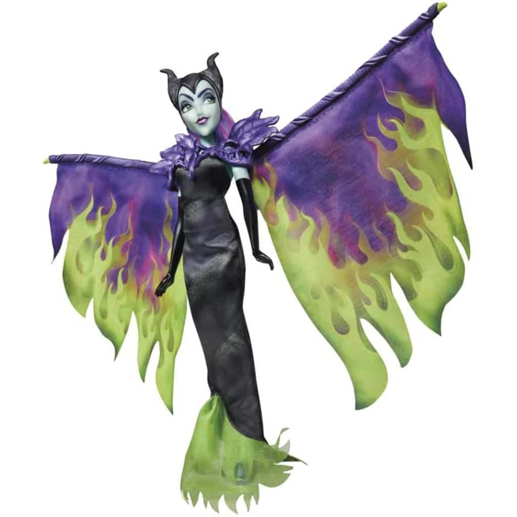 No filme A Bela Adormecida, a Malévola lança uma maldição sobre a bebê Aurora dentro de uma capa de chamas verdes mágicas. A boneca de 28 cm da famosa vilã do filme A Bela Adormecida da Disney vem com uma roupa deslumbrante, adorno de cabeça e capa que se move. Basta abaixar a alavanca nas costas da boneca para abrir a capa verde e roxa. Basta mover a alavanca para cima para reiniciar a capa. As crianças a partir dos 5 anos vão adorar revelar e esconder a capa novamente. Além da capa, a boneca Malévola vem com um vestido preto, colar e sapatos. Outras bonecas Disney Villains disponíveis como Cruella De Vil, a Rainha Má e Úrsula.