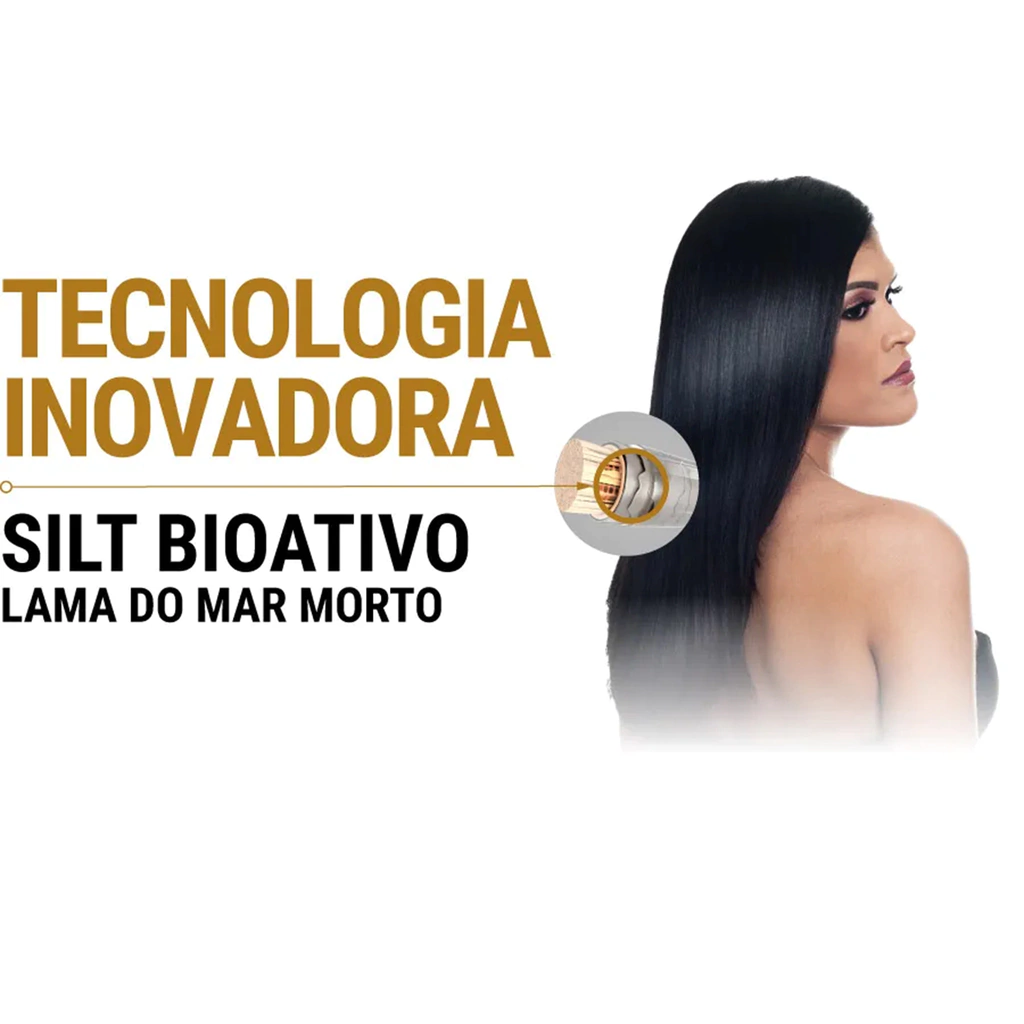 Contém Silt Bioativo (Lama do mar morto), tecnologia inovadora de ação antioxidante e hidratante, com resultados visíveis a partir da primeira aplicação! Devolve a elasticidade, sela as cutículas, une as pontas duplas e reduz volume. Com Escova Acetinada, os cabelos ganham vida, resistência, brilho e maciez.