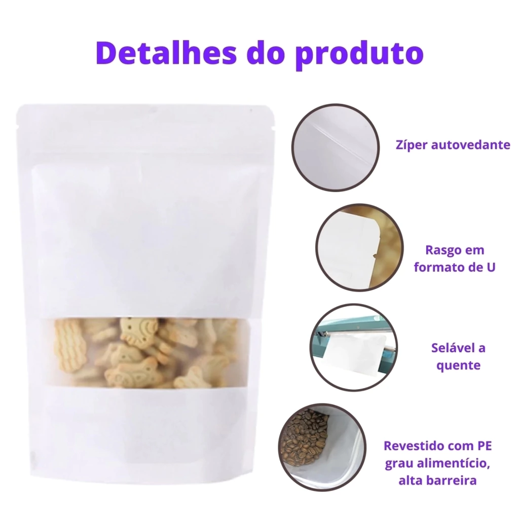 Este modelo aceita carimbo, o que permite a personalização direta na embalagem — ideal para produtores artesanais, pequenas marcas e empreendimentos criativos. Conta ainda com fechamento zip hermético reutilizável e fundo expansível, garantindo boa conservação e excelente apresentação vertical.