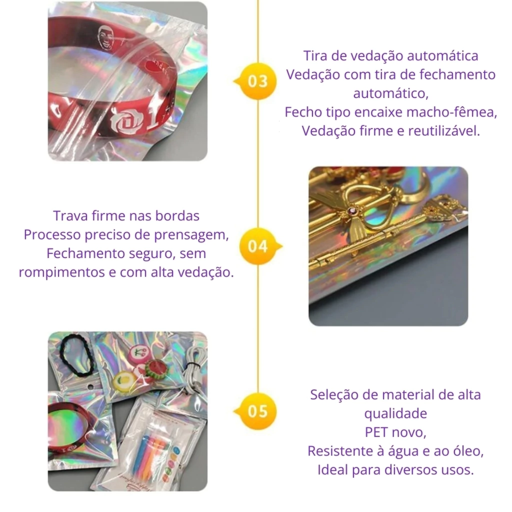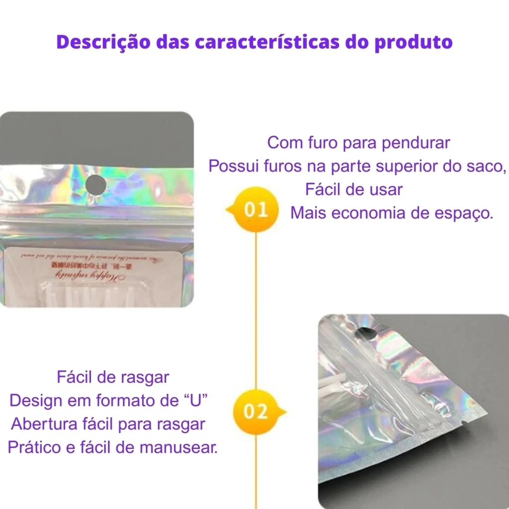 O Saco Zip Holográfico 9x16cm com Furo é uma embalagem moderna, prática e com visual chamativo, ideal para destacar seus produtos no ponto de venda. Com fechamento zip hermético reutilizável e furo superior central, é perfeito para exposição em ganchos. O acabamento holográfico valoriza ainda mais o conteúdo, sendo ideal para acessórios, brindes, cosméticos, produtos promocionais e amostras.